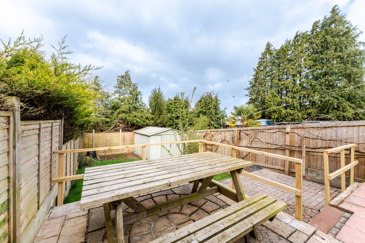 The rear garden is fully enclosed and designed with families in mind, combining lawn for play, a patio for seating, and a raised decking area for outdoor dining.