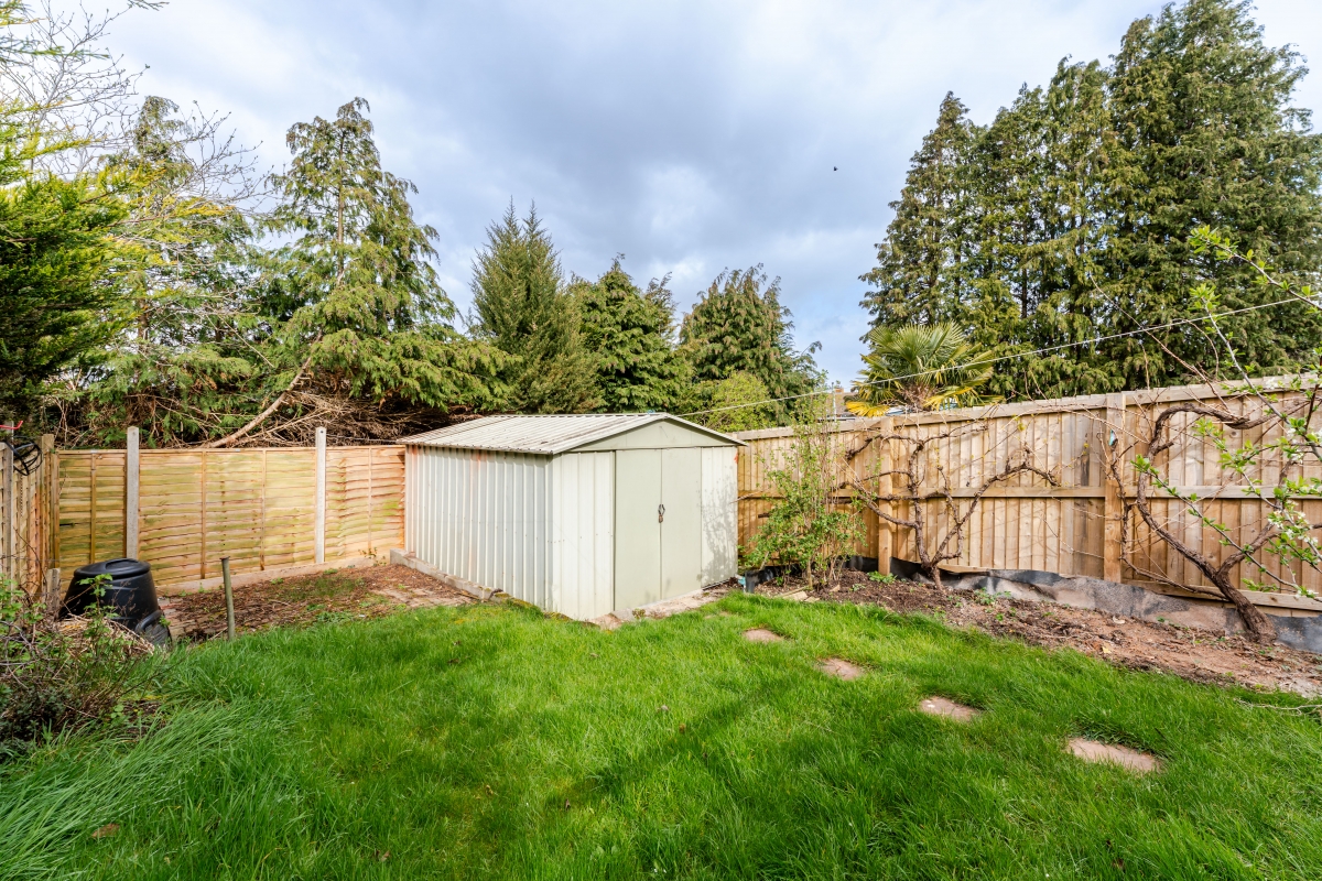 A large garden shed provides useful storage for bikes, tools, and outdoor equipment.